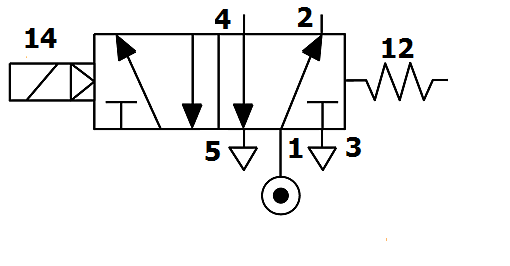 Solenoid valve 5/2 tác động điện từ đầu 14, đầu 12 tác động bằng lò xo, 5 cửa và 2 vị trí làm việc.